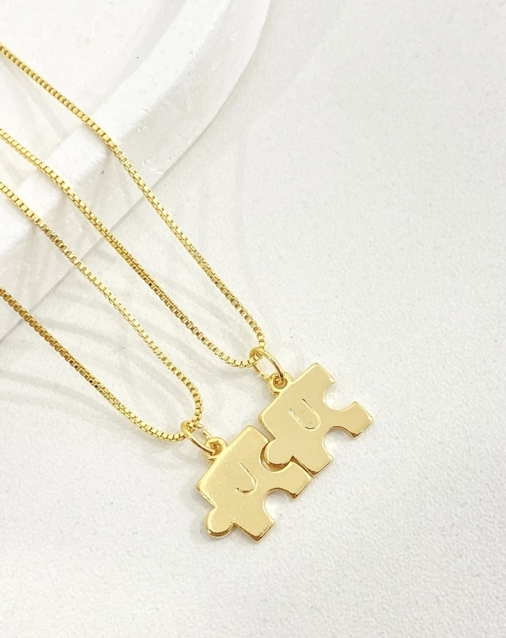 O Kit Love traz 2 colares com pingentes em formato de quebra-cabeça, símbolos perfeitos de conexão, união e amor. Cada peça é banhada em ouro 18k, garantindo brilho e acabamento sofisticado para momentos especiais.